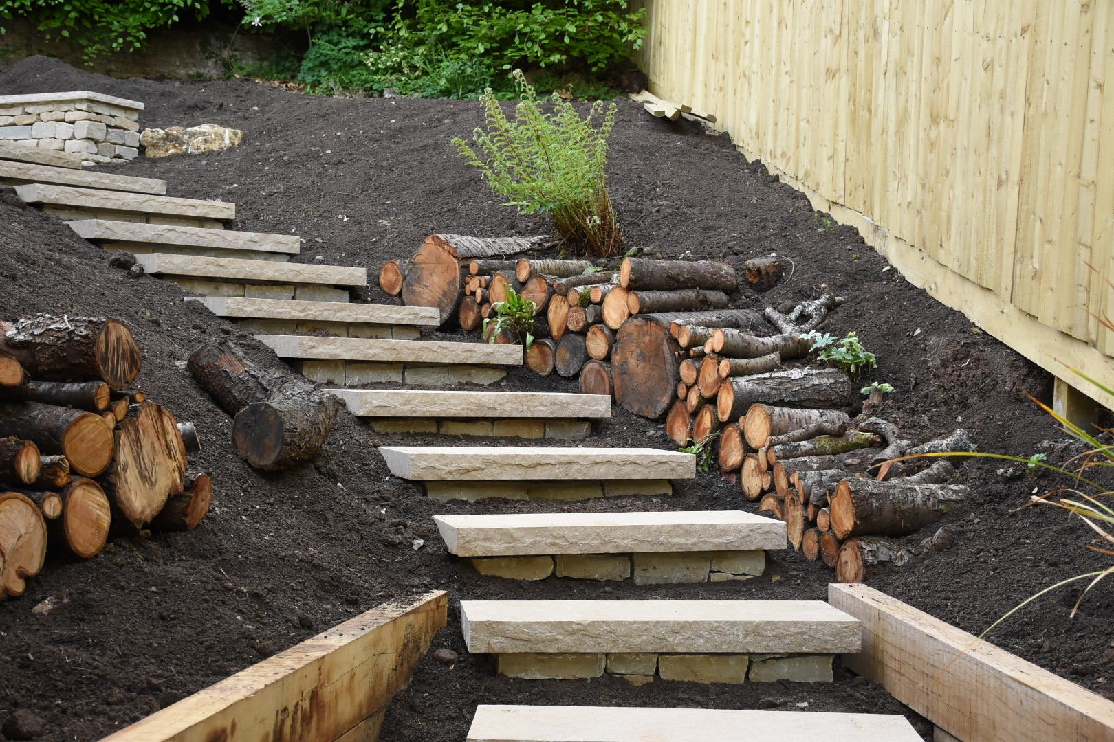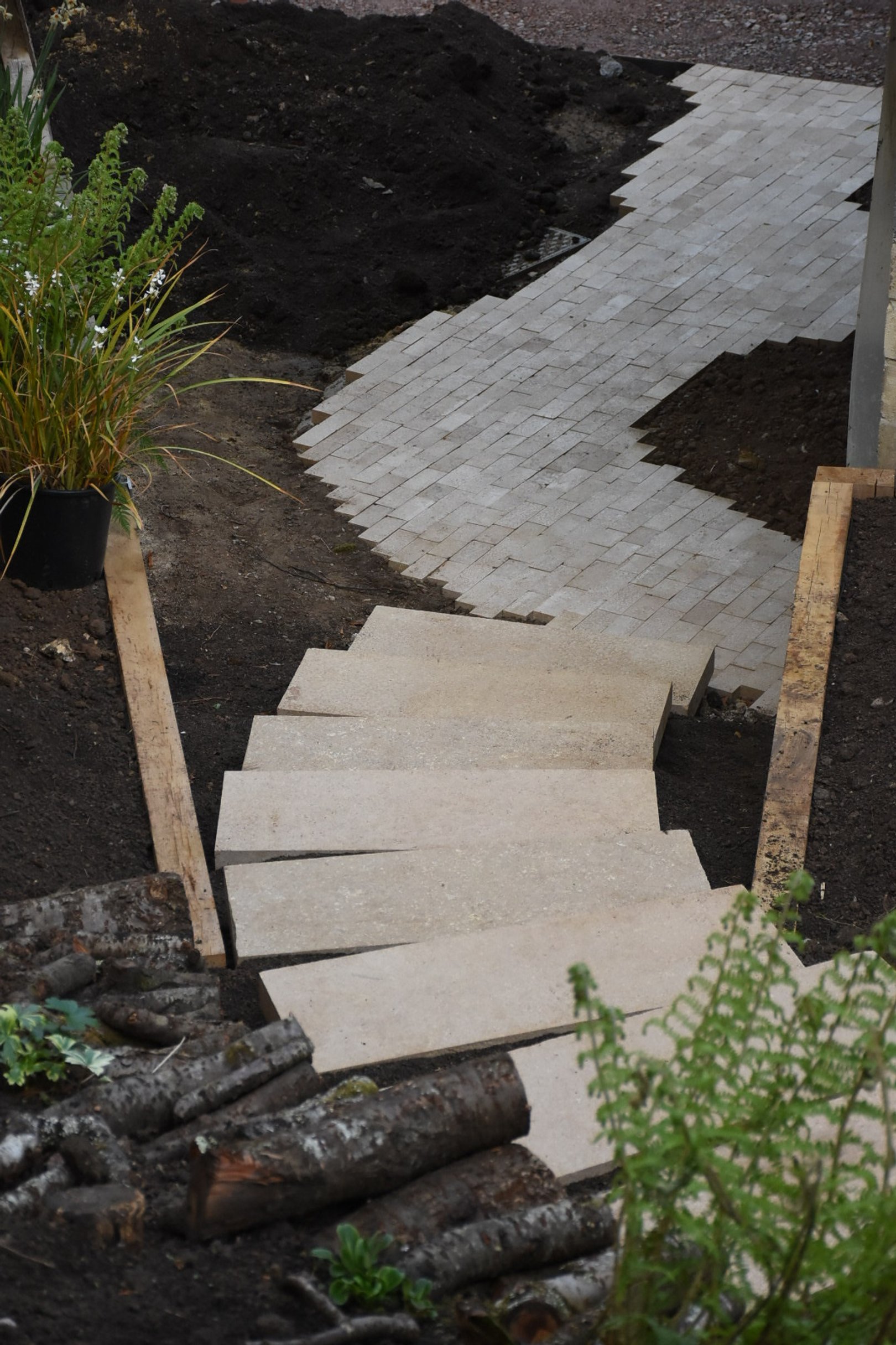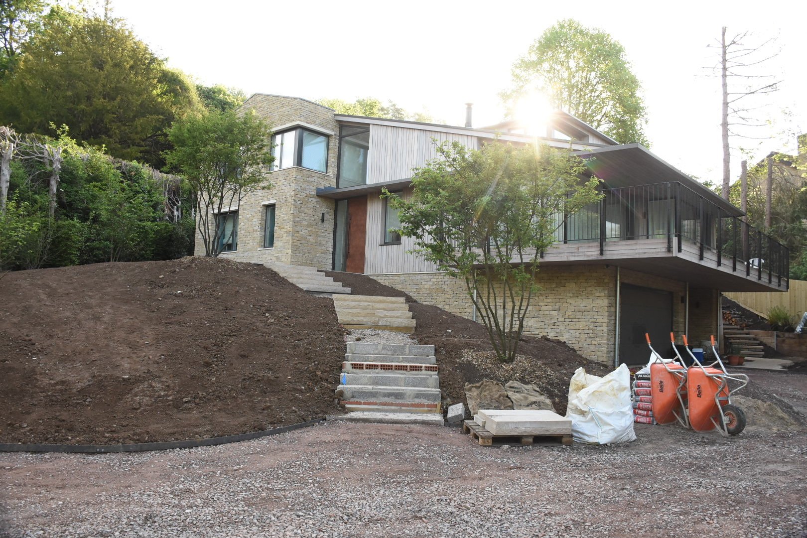 Collaboration with Seed Landscapes. This was essentially a blank canvas after the plot was cleared for a full renovation of the house — both interior and exterior. Seed Landscapes produced a beautiful, sensitive design with minimal hard landscaping, featuring a striking set of steps leading to the front door. The majority of the front gardens are now intentionally dedicated to meadow planting and native hedging, creating a soft, wildlife‑friendly approach to the house.