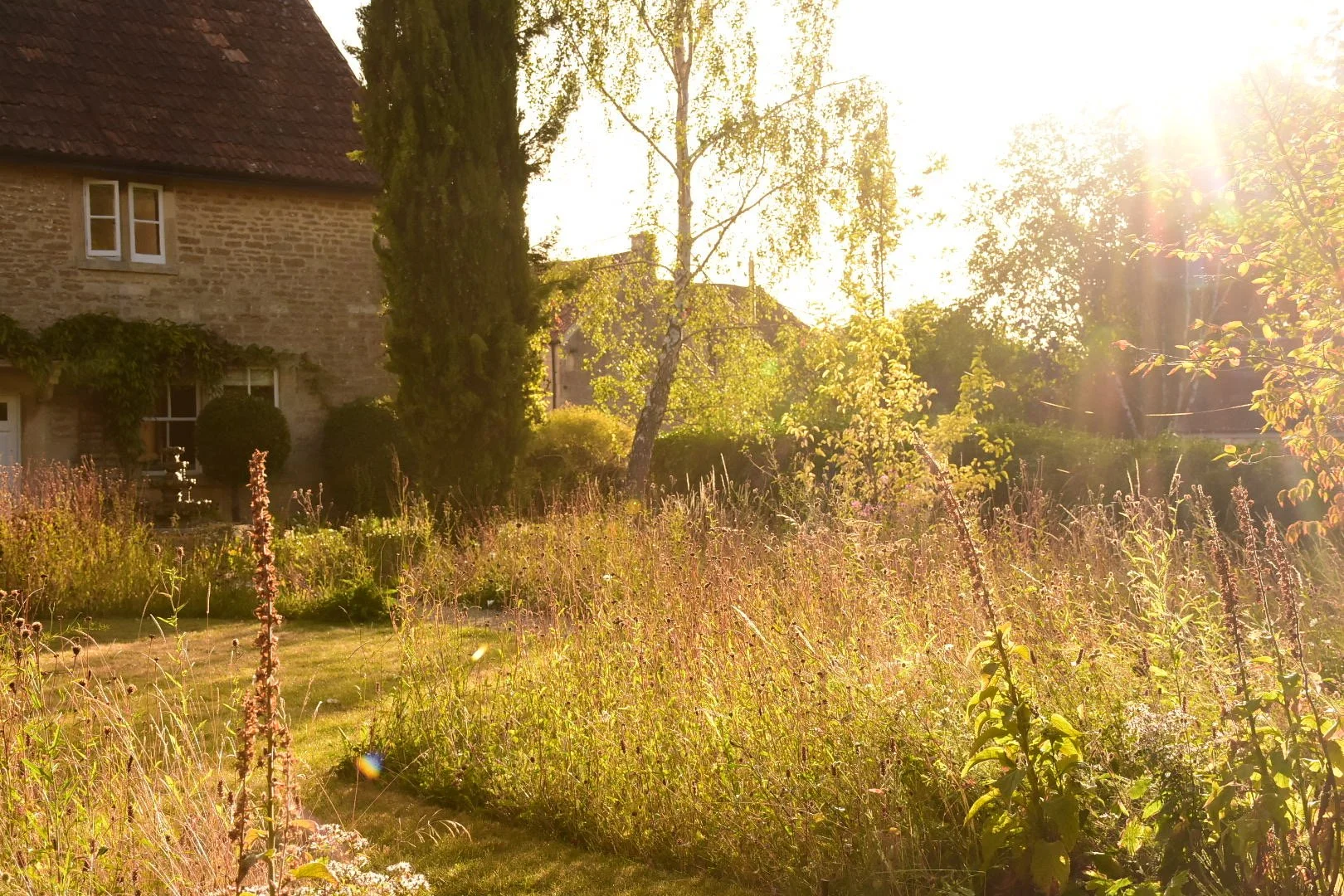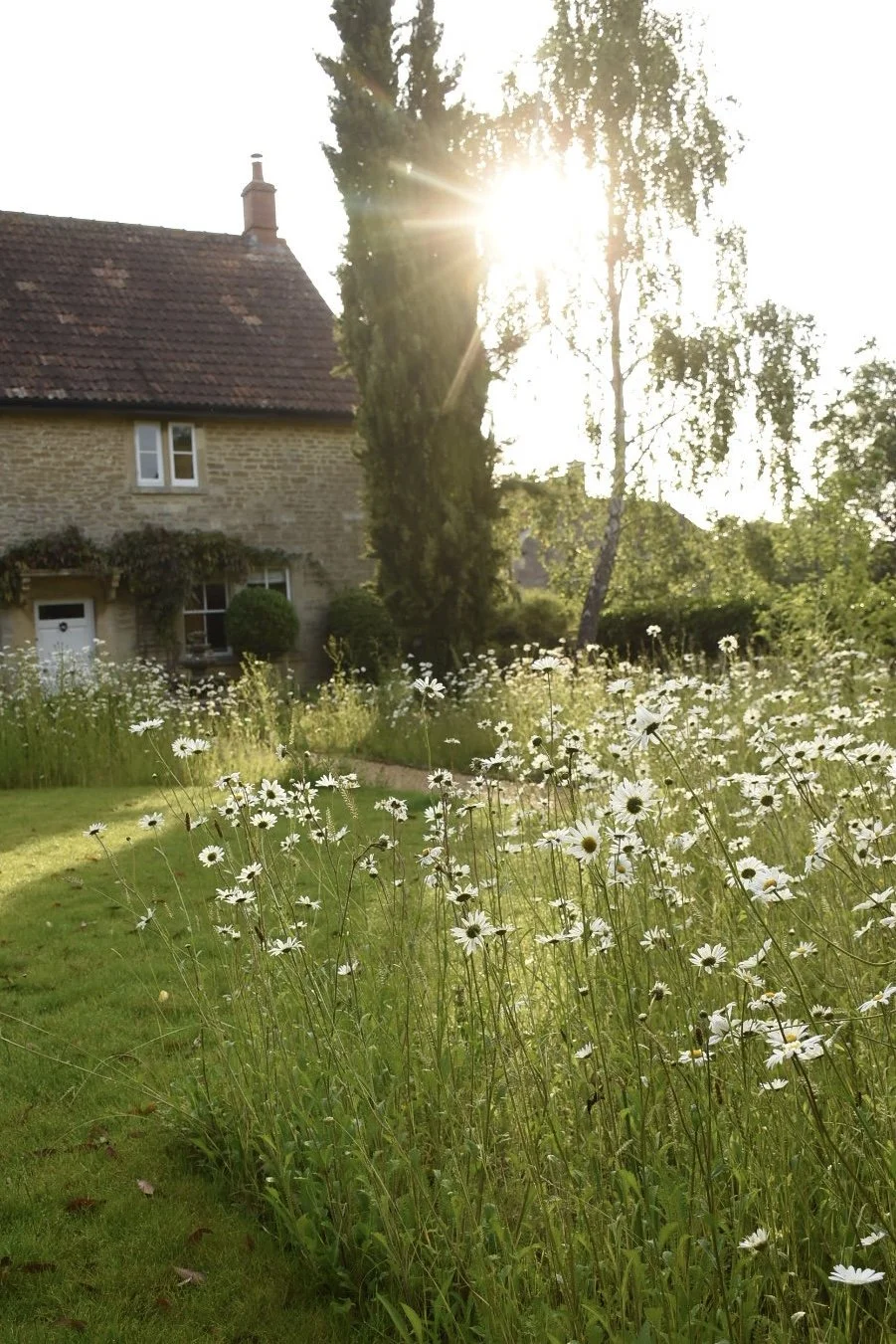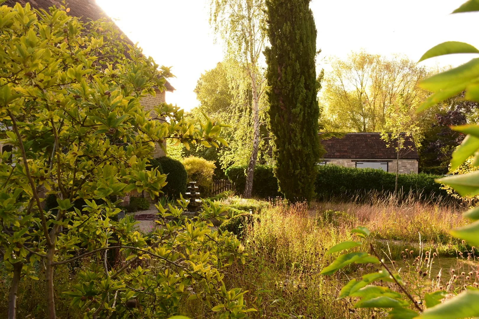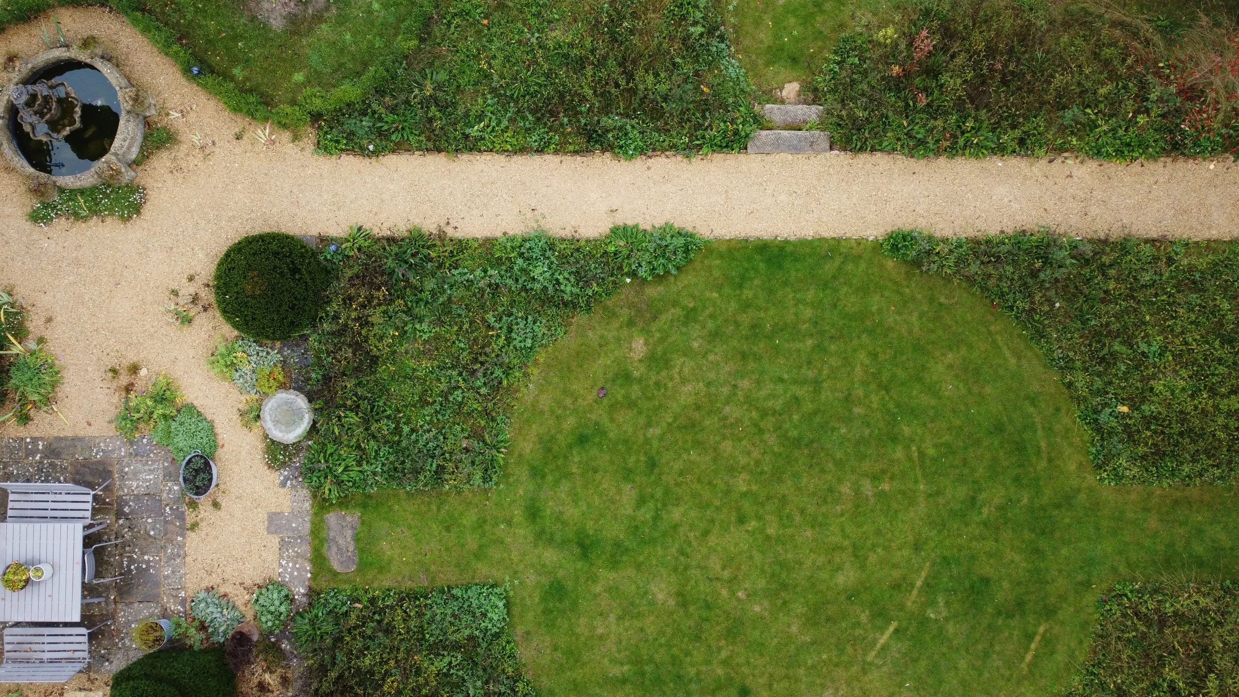 View of front gardens when entering gardens. At the front we made a new seating area outside the stunning bay window using the existing concrete pavers laying them differently than before. Feature topiary of varying heights grounded the house, enclosed the seating area making it a more cosy space to sit. Furthermore, we planted a Phillyrea serpentine hedge to wrap around existing water feature and cypress tree. We also planted in the gravel across front of house to soften the front and help merge it with the meadow. We sowed a new meadow which will encircle a now much smaller lawn. Evergreen planting will highlight front door. Due to the front levels being significantly changed we have planted pleached trees behind the new low drystone wall to screen next door.